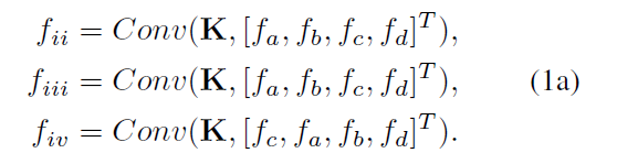 그럼 (i)에 convolution연산을 하기 위해서는 \( [f_a, f_b, f_c, f_d]^T \)의 형태로 만들어 kernel K와 연산 \( f1=Conv(K, [f_a, f_b, f_c, f_d]^T) \)를 하면 됩니다. (이때 \( Conv(A, B) \)는 point-wise product후에 값들을 더하는 것을 의미합니다)
