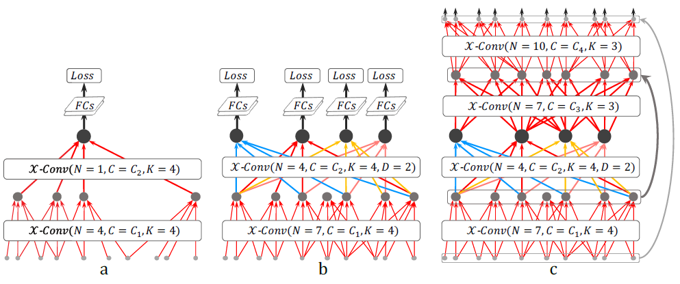Figure 4a : 두번의 X-Conv layer를 통해 더 많은 특징정보를 담고 있는 representation point를 구합니다. receptive field는 K/N(K : neighboring point number, N : point number in the previous layer)의 비율로 감소합니다. 생성되는 하나의 representation point는 전체 point들의 global view와 형상이 shape의 의미를 위한 feature를 갖고 있습니다.