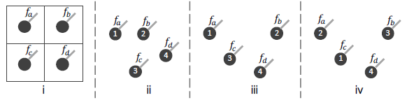 Figure 1은 (i) regular grid, (ii~iv) point cloud입니다. 각각의 data는 C-dimensional의 feature를 갖는 unodered set \( F=\{f_a, f_b, f_c, f_d\} \)이고 4*C의 shape을 갖는 하나의 kernel \( K=[k_a, k_b, k_r, k_d] \)이 있다고 가정하겠습니다.